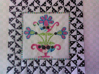 Despite the delightful distraction mentioned in the previous post I am getting a little appliqué done. This is another block from the BOM by Esther Aliu. Each month 2 different flowered are offered so I decided to make 2 quilts so I could do both blocks. This is block 1 of the second quilt. It still needs some embroidery but with a full house, I was lucky to get this done but I'm certainly not complaining. :)